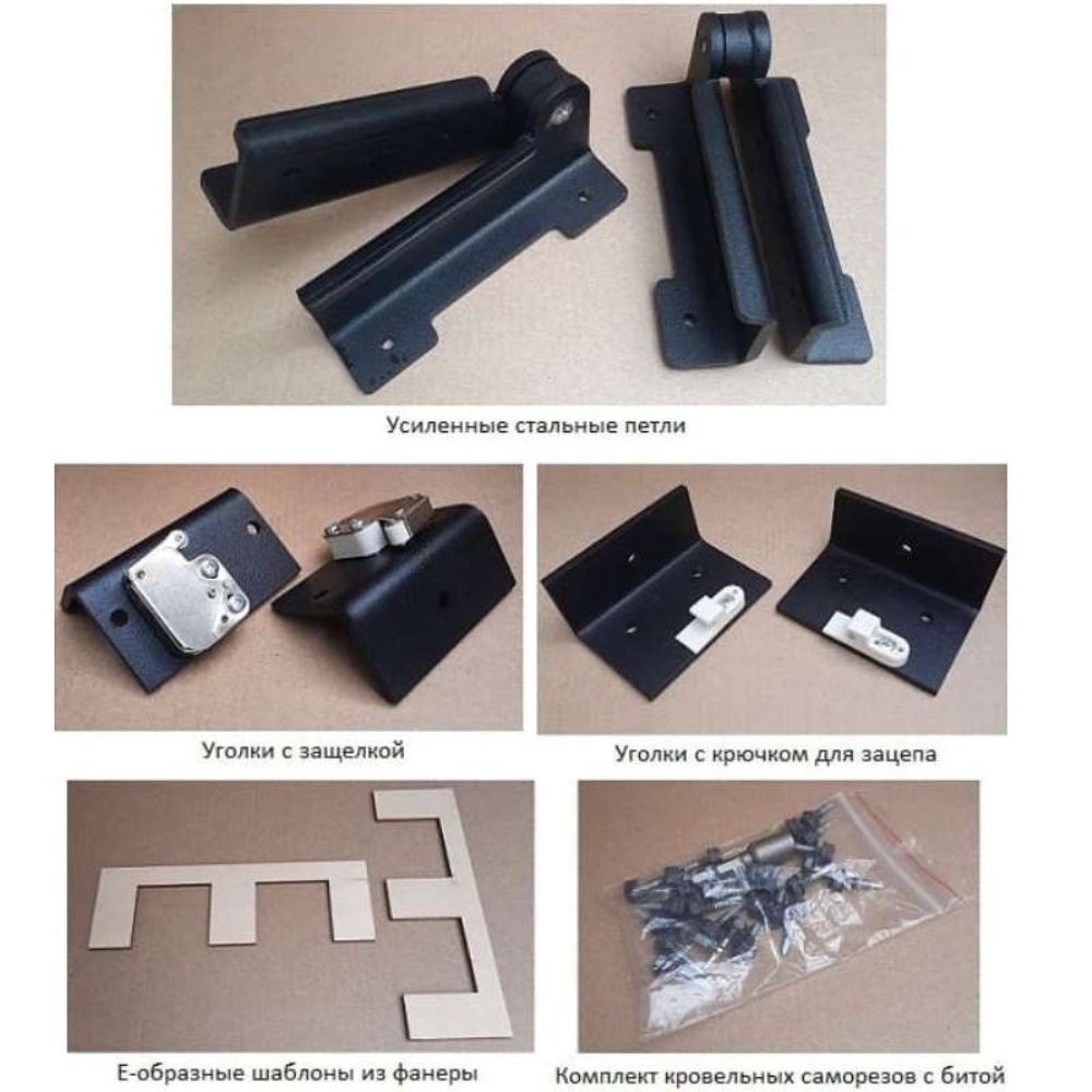 - Комплектация: Два усиленных петлевых механизма, два откидных замка с зацепом, два монтажных шаблона «Е», полный набор крепежа (кровельные саморезы 28 мм с битой), ограничители раскрытия 90°, запасные детали (зацеп и механизм), подробная инструкция.